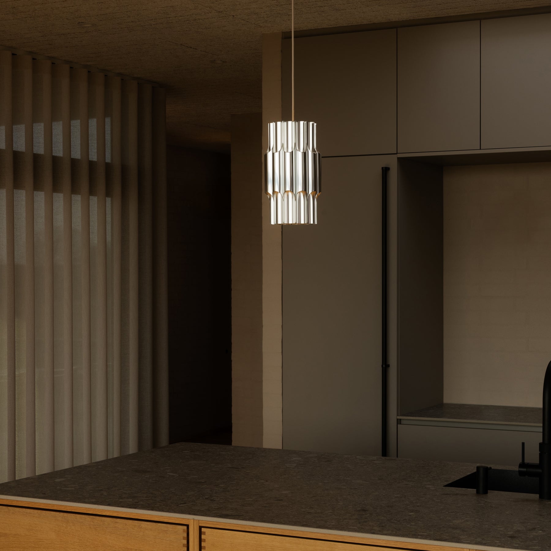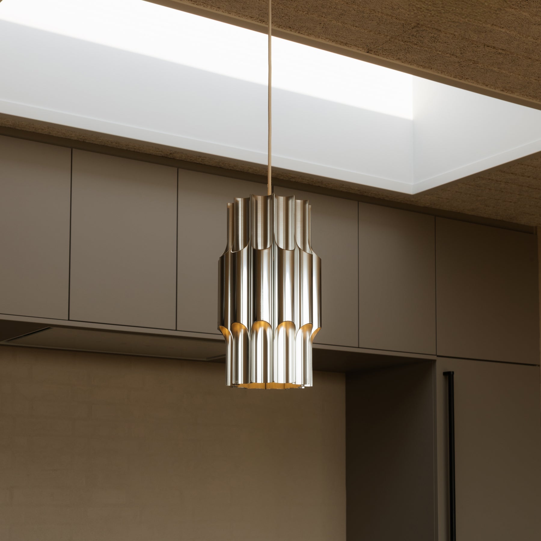 点灯、消灯にかかわらず存在感を放つアイコニックな「PAN」は照明器具でありアートでもあります。時代の精神性を捉え、さらに超越したデザインを生み出すというベント・カールビーの特殊な才能が発揮されたコレクションです。アルマイト加工されたアルミニウムのチューブを12本も配列して形どったペンダントは内部に樹脂のディフューザーを持ち、そこから透過した光がメタルチューブ上下の開口部から溢れます。光沢あるメタルチューブの内面から上下に流れ出る光のリズムがこのスケール以上の存在感を醸し出しています。その装飾光とは別に、中央開口部から直下への光は確保されています。PAN WALL 50/95では異なる長さと径のチューブを用いて壁面へのアクセントを提案しています。